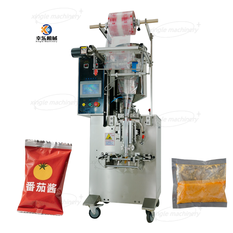 XLYP-61 sauce packaging machine is a vertical automatic packaging equipment that integrates intelligent control and high-efficiency production. The entire machine is controlled by a PLC combined with a touch screen, and can automatically complete the entire packaging process from bag making, metering, filling to sealing, cutting, and counting. It is an ideal choice for improving enterprise production efficiency and product packaging quality.